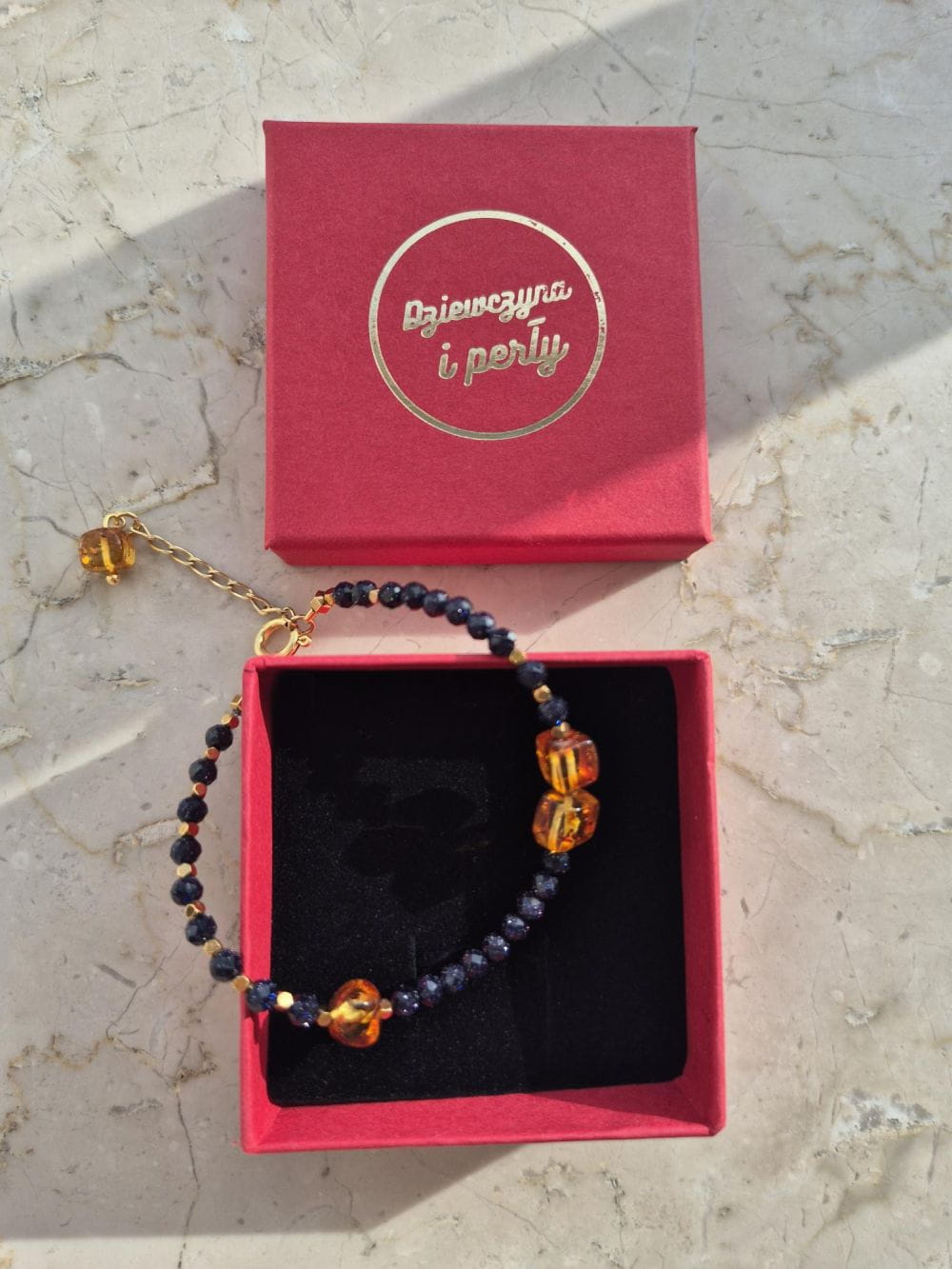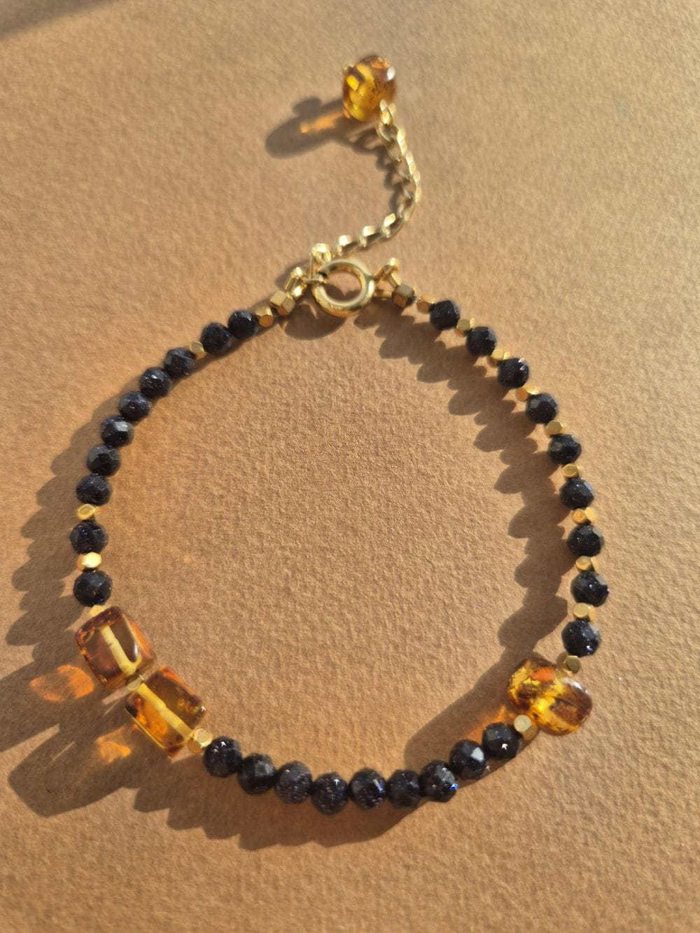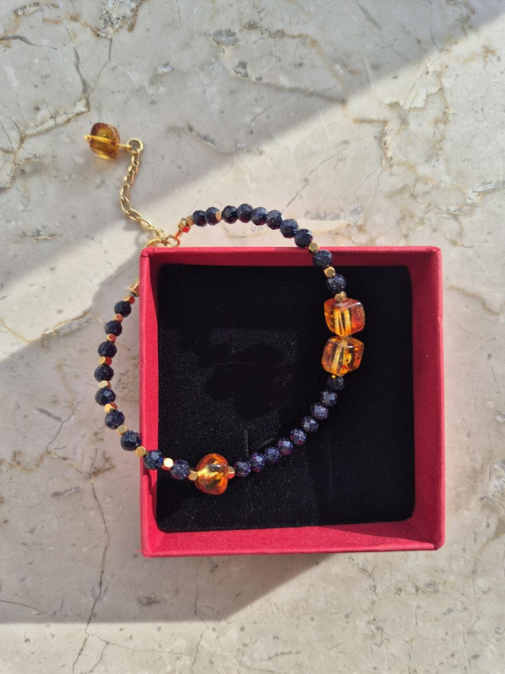 Bransoletka z tej samej kolekcji zachwyca subtelnym, migoczącym blaskiem i oryginalną kompozycją kamieni. Wykonana ręcznie z granatowych kamieni Noc Kairu, naturalnego bursztynu oraz złotych hematytów, tworzy elegancki dodatek o wyjątkowym charakterze.