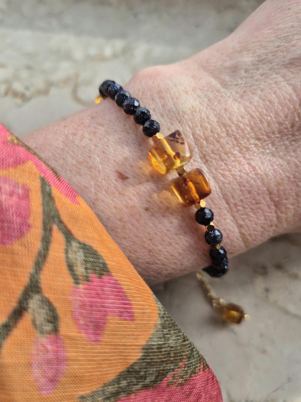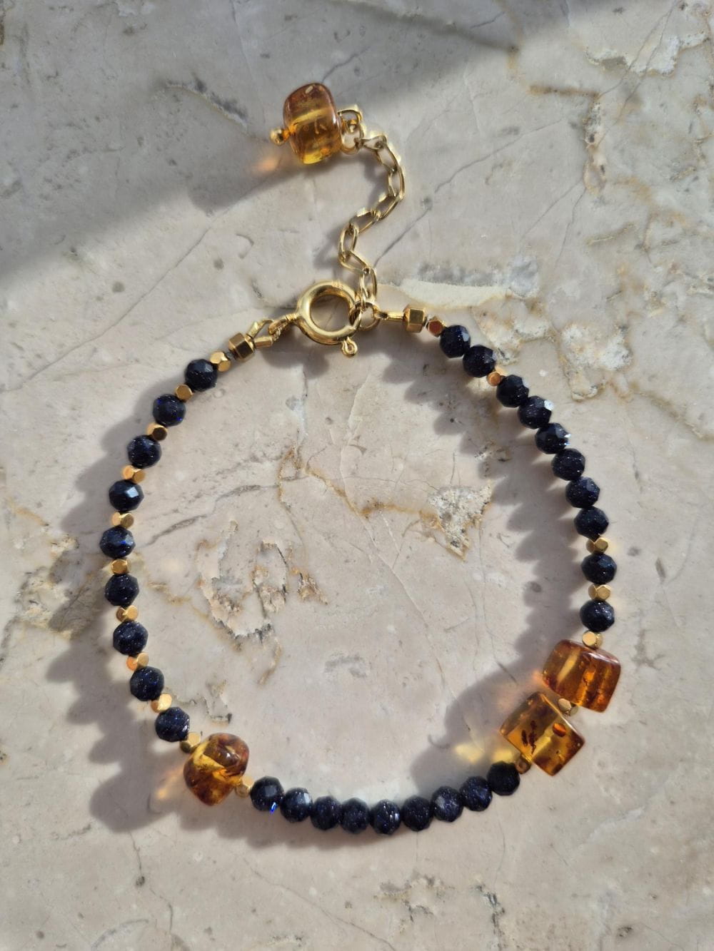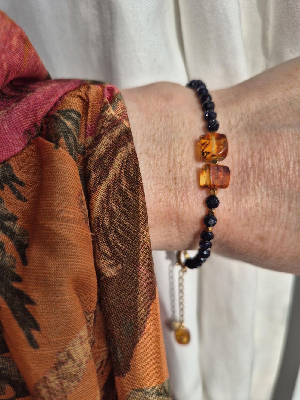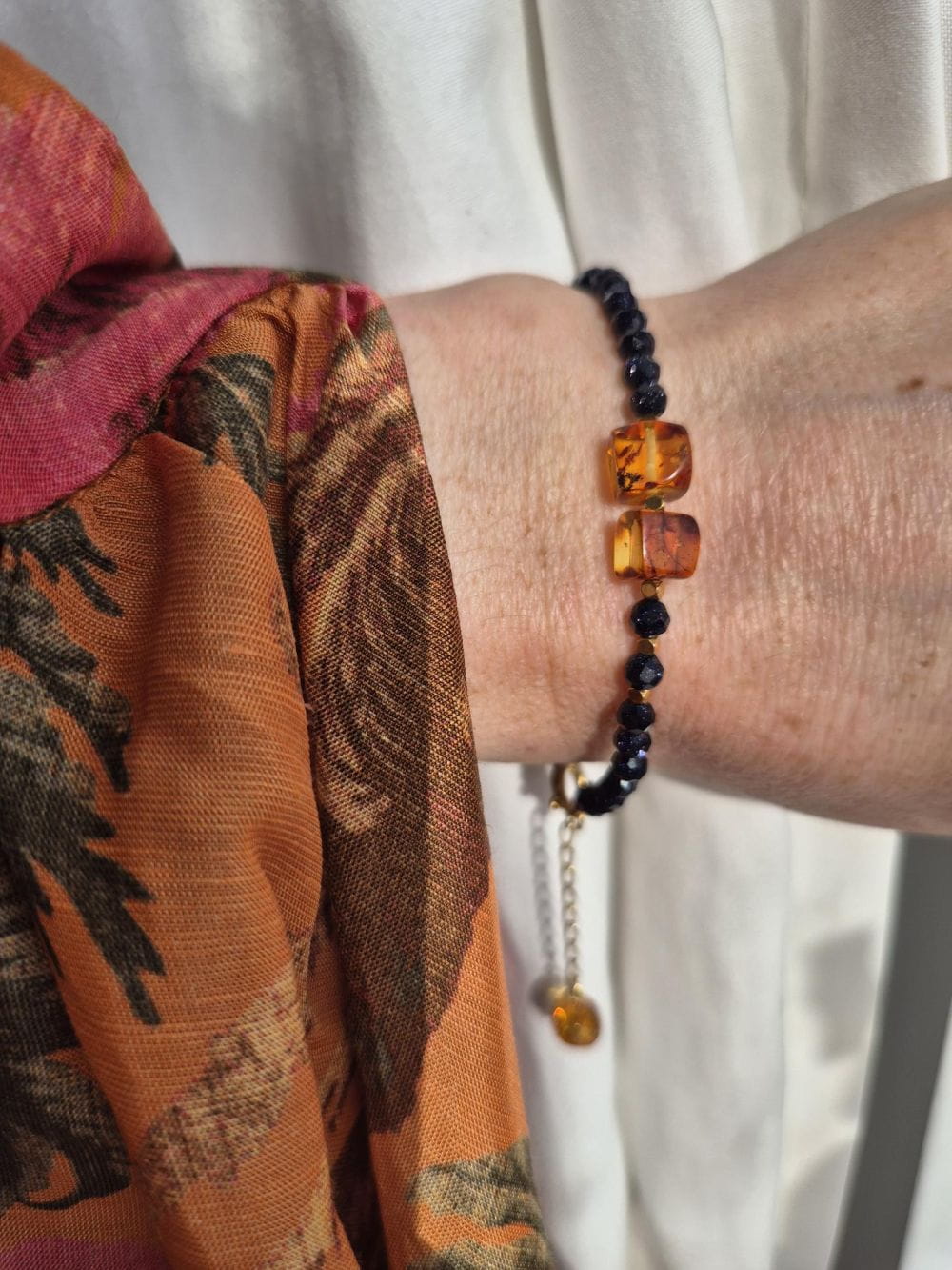 Bransoletka z tej samej kolekcji zachwyca subtelnym, migoczącym blaskiem i oryginalną kompozycją kamieni. Wykonana ręcznie z granatowych kamieni Noc Kairu, naturalnego bursztynu oraz złotych hematytów, tworzy elegancki dodatek o wyjątkowym charakterze.