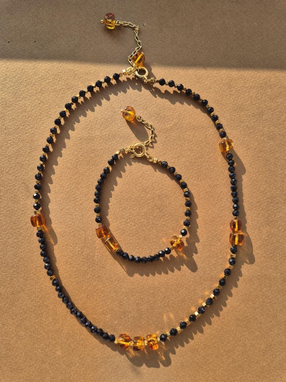Sercem tej kolekcji są kamienie o poetyckiej nazwie Noc Kairu. Ich intensywny, granatowy kolor skrywa delikatne, migoczące drobinki przypominające gwiazdy. W zestawieniu z naturalnym polskim bursztynem nabierają wyjątkowego charakteru – chłodny blask granatu spotyka się tu z ciepłem złocistej żywicy, tworząc kontrast pełen elegancji i naturalnego piękna.
