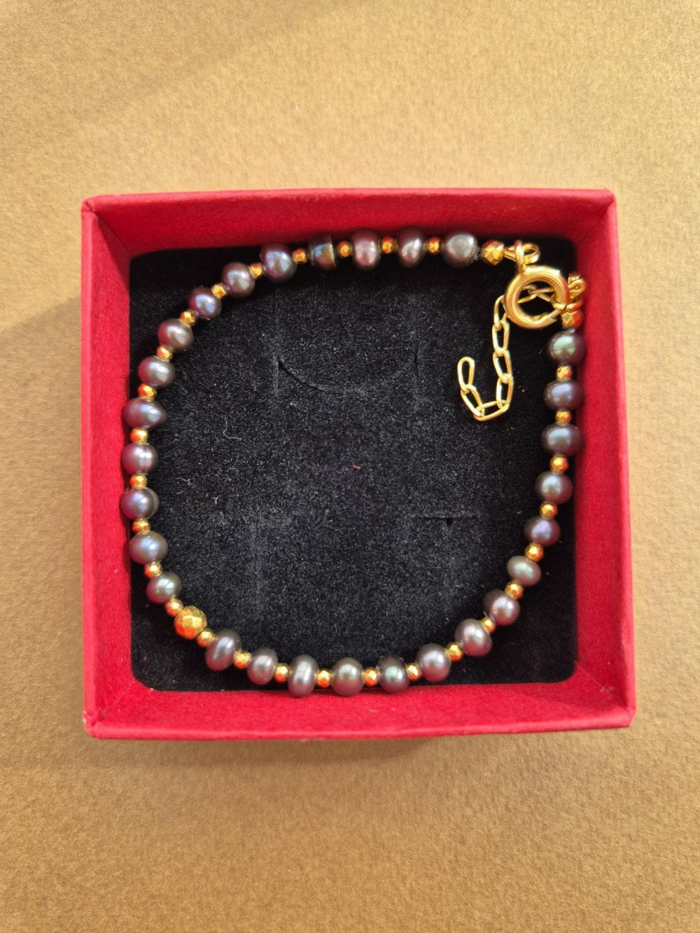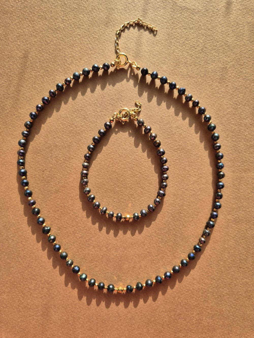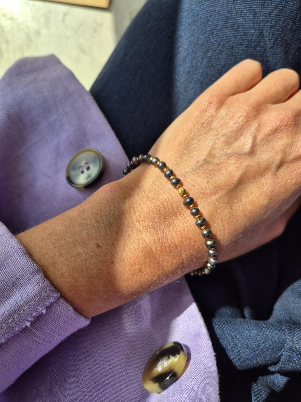 Bransoletka wykonana ręcznie z naturalnych, czarnych pereł przetykanych złotymi hematytami. Czarne perły są wyjątkowe, mienią się pięknie wszystkimi kolorami tęczy: granatem, fioletem i brązem. Bransoletka jest bardzo eleganckim dodatkiem do codziennych i wyjątkowych okazji. Jej tajemniczy blask pięknie podkreśli brązy, granaty, odcienie bordo.