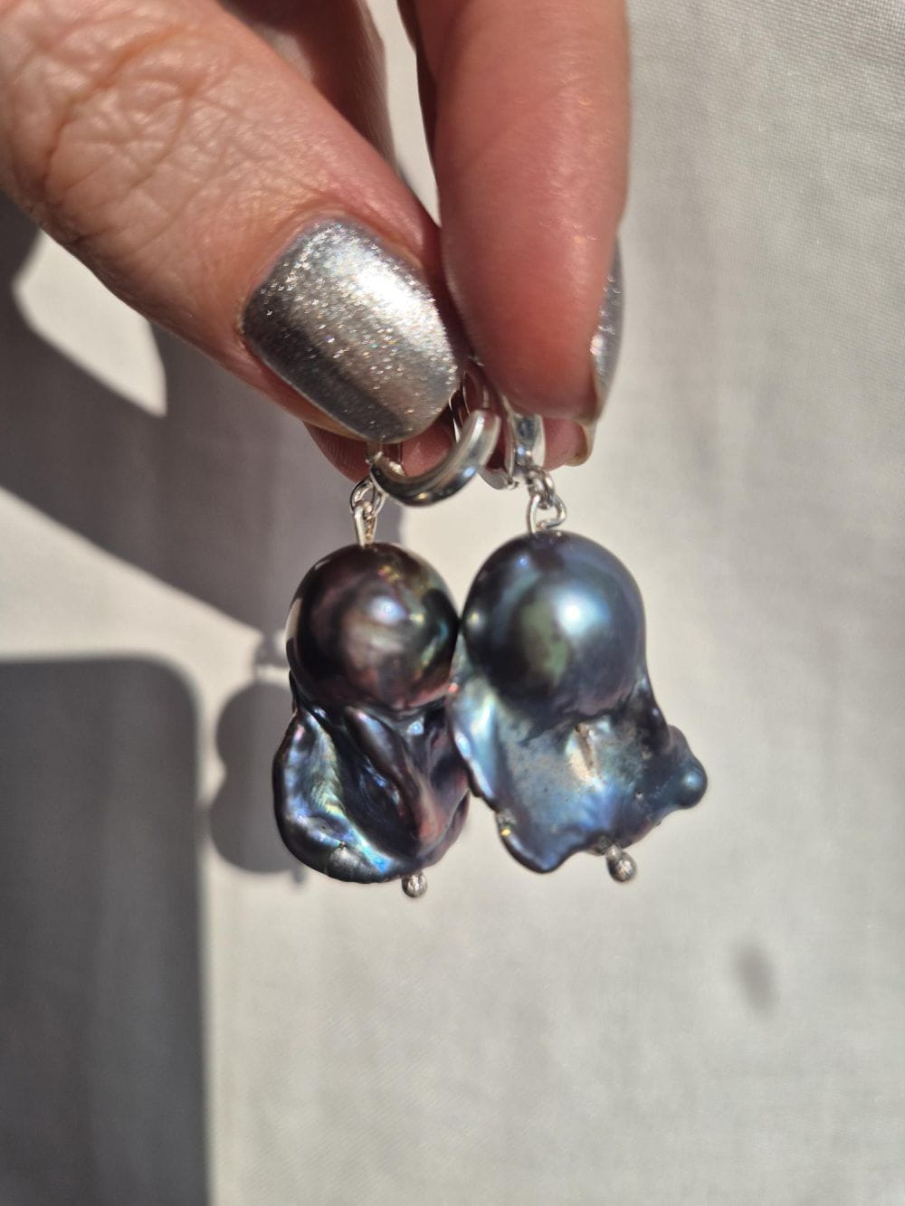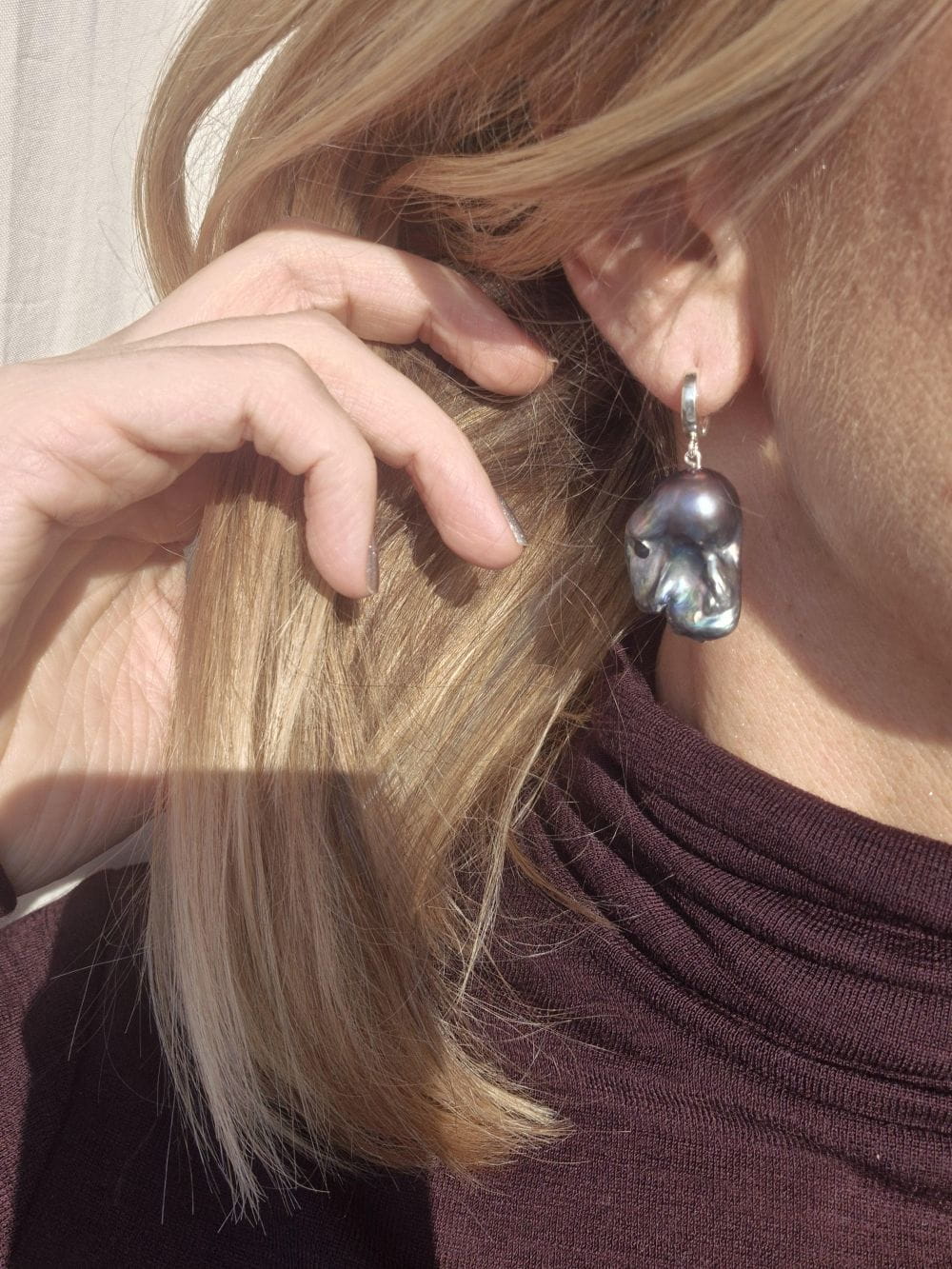 Eleganckie kolczyki z naturalnych pereł barokowych zachwycających wielowymiarowym połyskiem w odcieniach błękitu, fioletu i subtelnego różu. Każda perła ma niepowtarzalny, organiczny kształt, dzięki czemu każda para kolczyków jest absolutnie unikatowa.