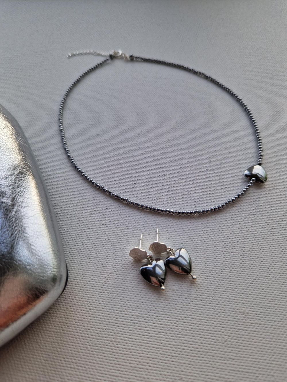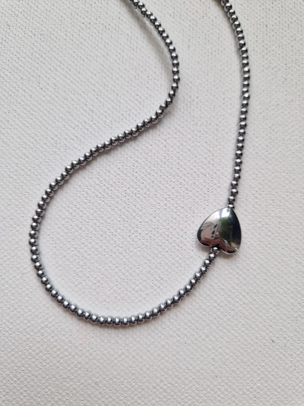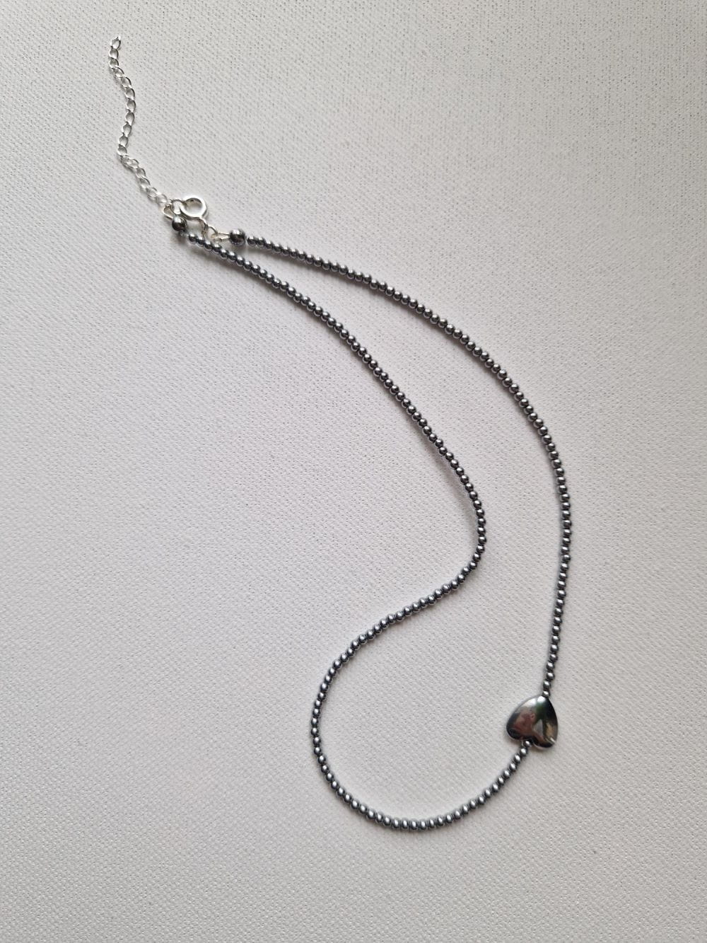 Minimalistyczny naszyjnik z drobnych, okrągłych, gładkich, naturalnych hematytów w kolorze srebra, ozdobiony ułożonym niesymetrycznie sercem. Lekkości dodaje mu srebrny łańcuszek. Świetnie komponuje się ze swetrami, sukienkami, t.shirtami i innymi naszyjnikami z tej kolekcji. Z łatwością możesz do niego dopasować pierścionek https://www.dziewczynaiperly.pl/pl/p/Zestaw-srebrnych-pierscionkow-z-serduszkiem-i-kulka/251, kolczyki https://www.dziewczynaiperly.pl/pl/p/Srebrne%2C-wiszace-kolczyki-z-serduszkami/243lub inny naszyjnik https://www.dziewczynaiperly.pl/pl/p/Grafitowy%2C-asymetryczny-naszyjnik-z-sercem-/248.