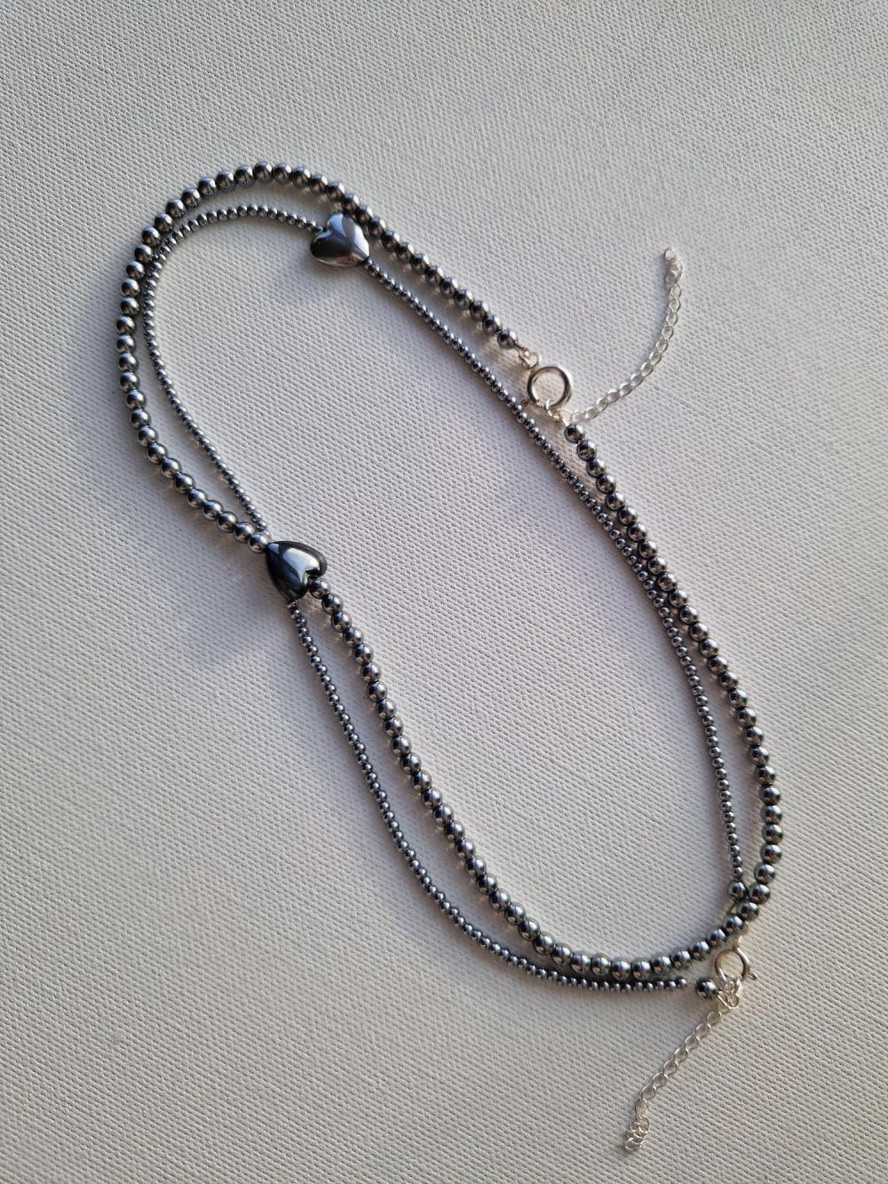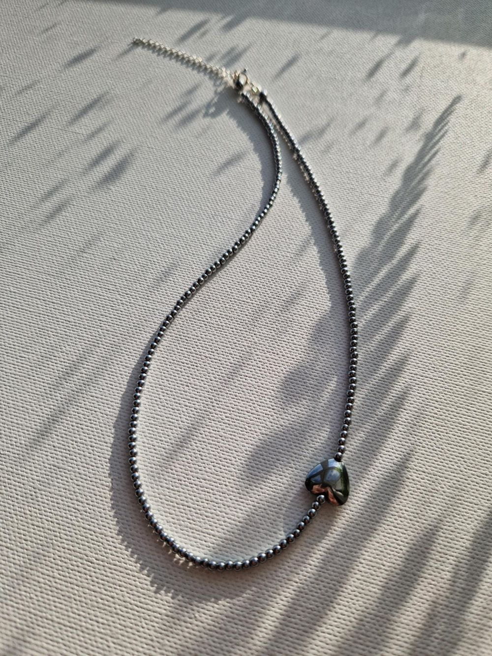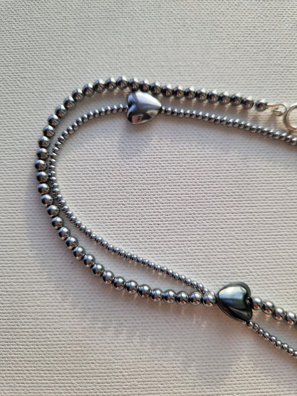 Minimalistyczny naszyjnik z drobnych, okrągłych, gładkich, naturalnych hematytów w kolorze srebra, ozdobiony ułożonym niesymetrycznie sercem. Lekkości dodaje mu srebrny łańcuszek. Świetnie komponuje się ze swetrami, sukienkami, t.shirtami i innymi naszyjnikami z tej kolekcji. Z łatwością możesz do niego dopasować pierścionek https://www.dziewczynaiperly.pl/pl/p/Zestaw-srebrnych-pierscionkow-z-serduszkiem-i-kulka/251, kolczyki https://www.dziewczynaiperly.pl/pl/p/Srebrne%2C-wiszace-kolczyki-z-serduszkami/243lub inny naszyjnik https://www.dziewczynaiperly.pl/pl/p/Grafitowy%2C-asymetryczny-naszyjnik-z-sercem-/248.