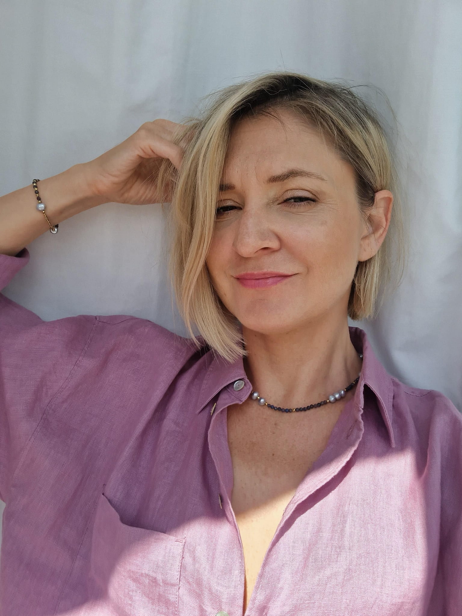 Komplet biżuterii to niezwykły mariaż chłodnych barw z ciepłymi. Bransoletka i naszyjnik wykonane ręcznie z szarych pereł, niebieskich szafirów i połyskujących złotem hematytów.