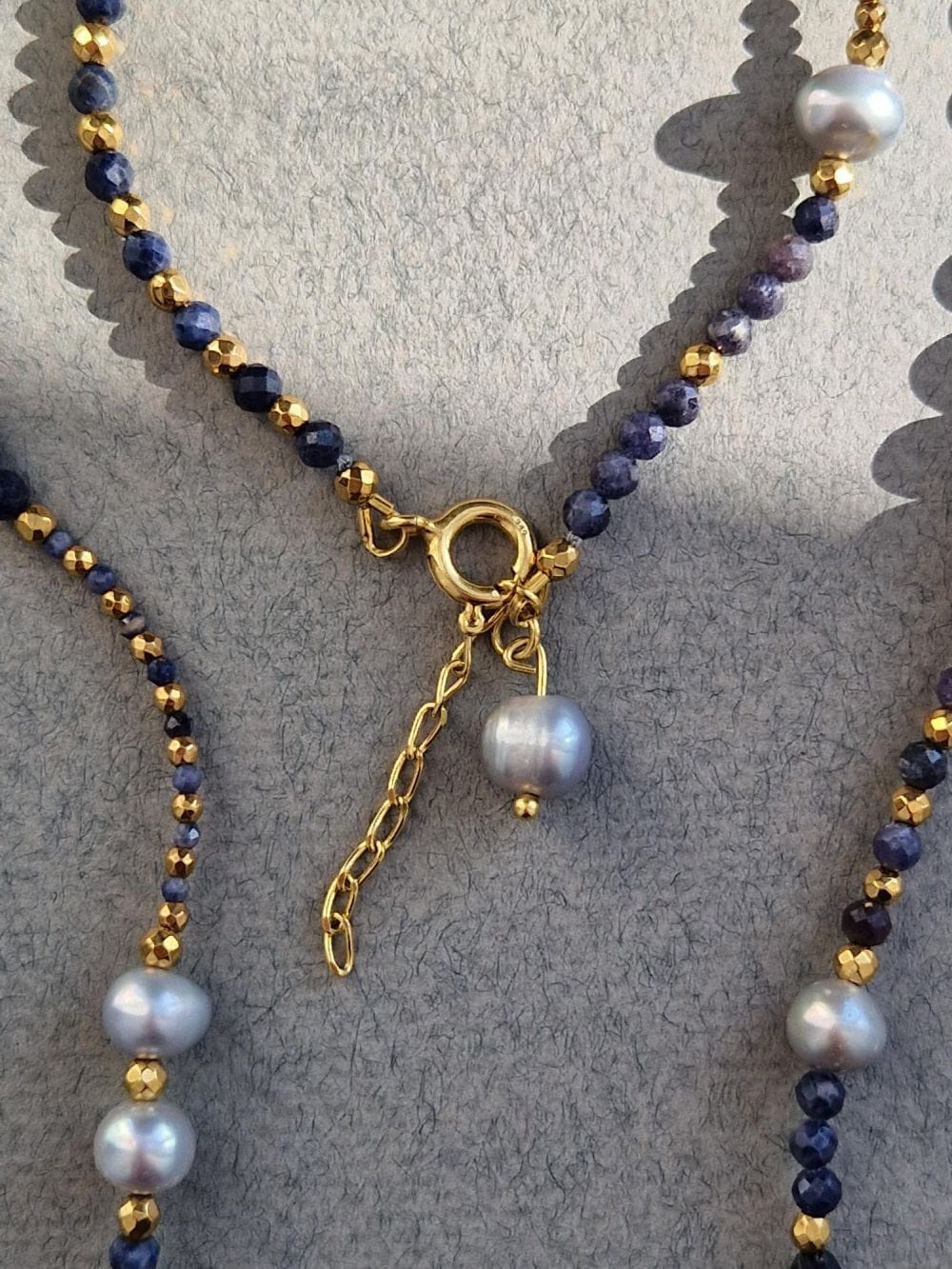 Taniej w zestawie!Złoty naszyjnik przeplatany szarymi perłami, niebieskimi szafirami i złotymi hematytami