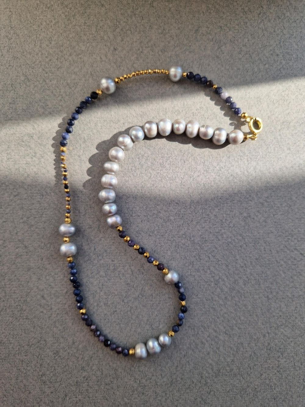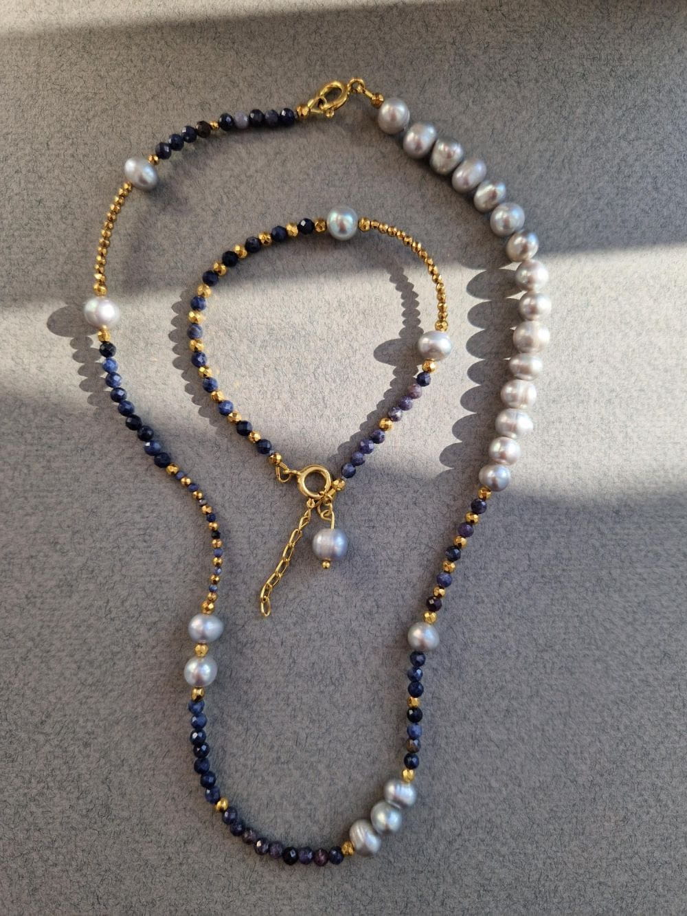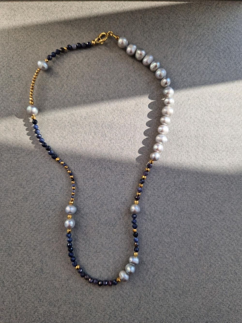 Złoty naszyjnik z szarych pereł i niebieskich szafirów
