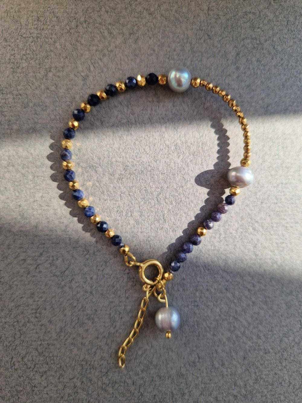 Taniej w zestawie!Bransoletka wykonana z szafirów, szarych pereł i złotych kamieni.